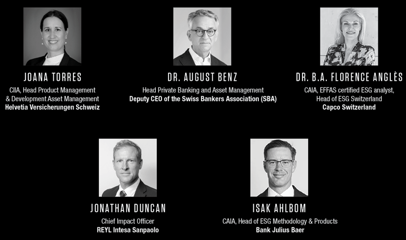 The event brought together a distinguished panel: Joana Torres, CIIA, Head Product Management & Development Asset Management, Helvetia Versicherungen Schweiz, Dr. BA Florence Anglès, CAIA, FDP, EFFAS certified ESG analyst, Head of ESG Switzerland, Capco Switzerland, Dr. August Benz, Head Private Banking and Asset Management, Deputy CEO of the Swiss Bankers Association (SBA), Isak Ahlbom, CAIA, Head of ESG Methodology & Products, Bank Julius Baer, and Jonathan Duncan, Chief Impact Officer, REYL Intesa Sanpaolo.