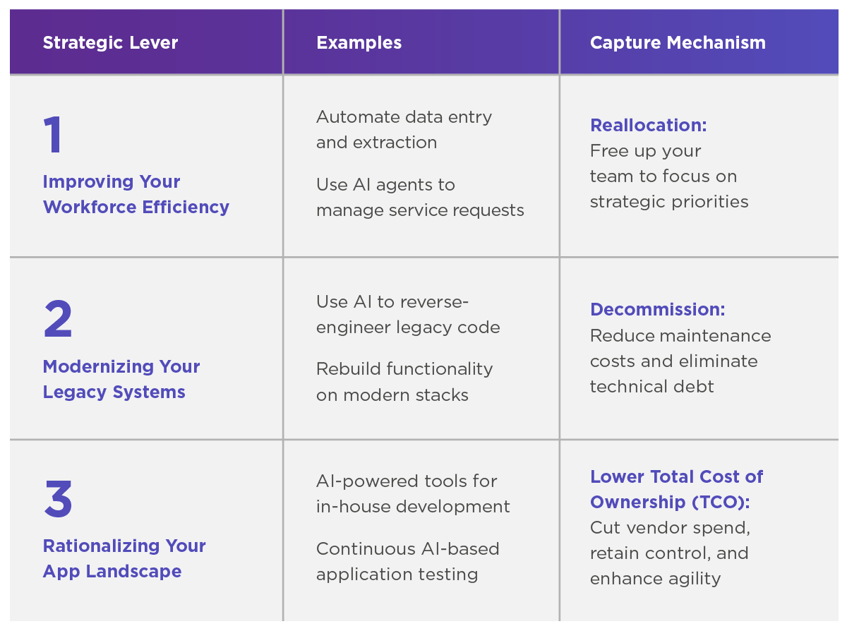 You unlock cost savings and value by applying AI across three high-impact levers — balancing quick wins and long-term transformation.