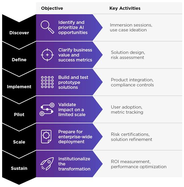 Our proven, six-step process allows you to systematically identify high-value use cases, validate feasibility and viability, and deliver long-term impact.