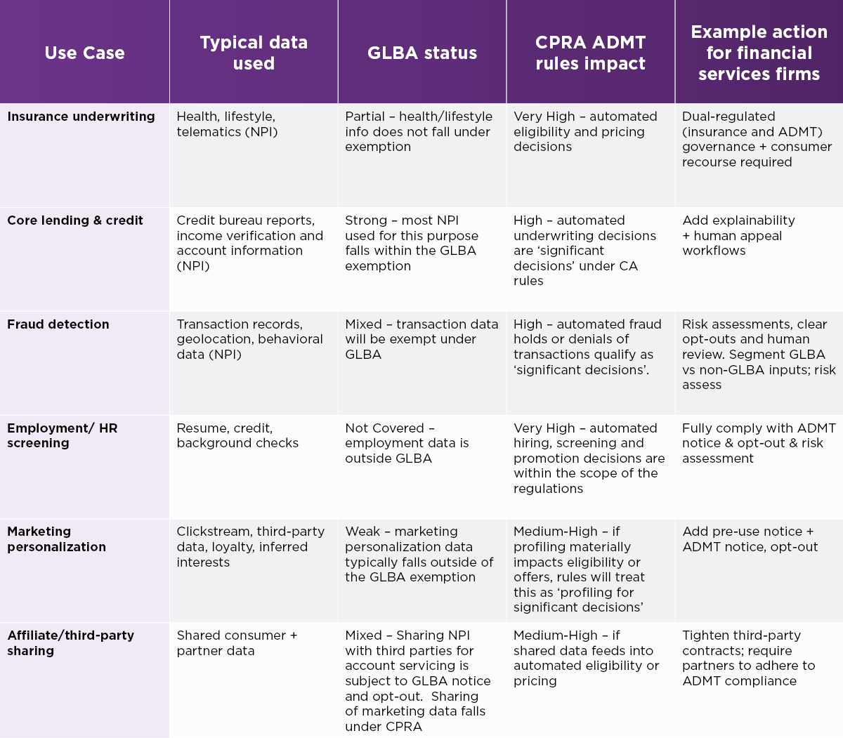 These use cases demonstrate that as financial institutions increase their use of AI tools in their servicing operations, GLBA provides less air cover under the new CPRA regulations. The combination of automated decision-making and hybrid data sets used to formulate many decisions means that they will fall squarely within the scope of the new regime.